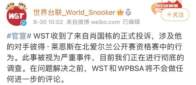 WST收到了来自肖国栋的正式投诉,涉及他的对手彼得·莱恩斯在北爱尔兰公开赛资格赛中的行为。此事被视为严重事件,目前我们正在进行彻底的调查。在问题解决之前,WST和WPBSA将不会做任何进一步的评论。