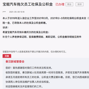 据西安秦汉新城管委会在人民网领导留言板回复网友针对宝能汽车“断交员工社保、公积金”投诉时称,经秦汉新城人社民政局前往宝能汽车销售有限公司调查核实,网友反映的情况属实。