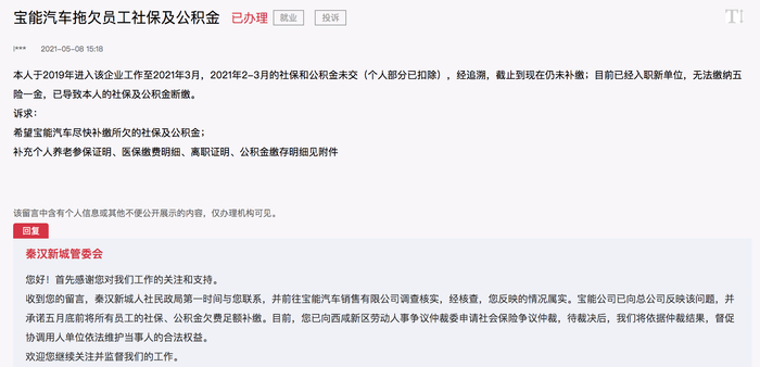 进入到2021年以来,有关宝能“裁员”、“断交员工社保”等相关信息层出不穷。界面新闻记者对相关信息进行梳理后发现,有关针对宝能汽车断交员工社保、公积金等投诉反馈主要集中在今年一季度。