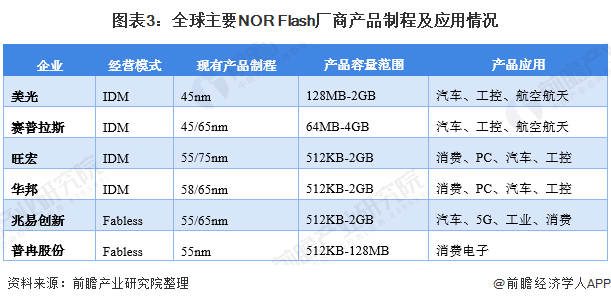 从全球NOR Flash龙头企业来看,旺宏、华邦、美光、赛普拉斯和兆易创新是世界前五大NOR Flash制造商。市场高端玩家美光与赛普拉斯目前均已采用最先进的45nm制程,中低端市场主要产商兆易创新与旺宏于2019年推出55nm制程,华邦预计于2021年量产45nm制程产品。