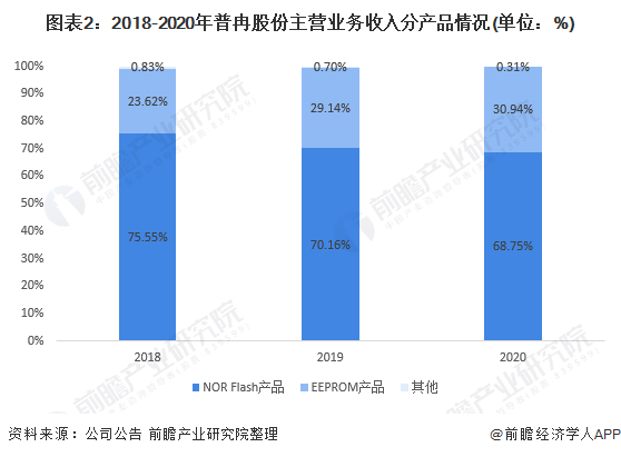 普冉股份成立于2016年,是国内领先的存储芯片设计公司,目前已逐渐形成以NOR Flash和EEPROM存储器芯片为主的产品矩阵。其中,2018-2020年公司NOR Flash收入占总营收比重分别为75.55%、70.16%、68.75%,为公司第一大产品,其次为EEPROM,2020年占比为30.94%。
