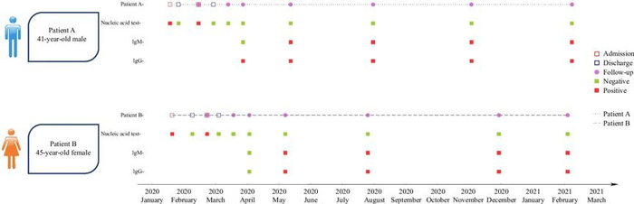 截至2021年2月9日,患者A和患者B在一年内被随访了7次(如下图)。两位患者在出院后约半个月的第一次随访中,核酸检测结果均显示阳性,立即再次入院。第二次出院后,两名患者继续参与定期随访,他们的核酸检测均为阴性。然而从第四次随访(发病后约四个月)到最近一次随访(发病后约一年)中,他们的新冠病毒特异性IgM抗体检测结果一直保持阳性。