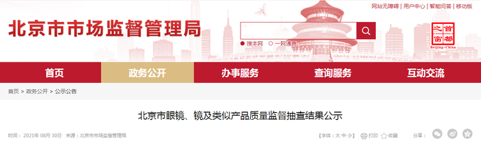 中国质量新闻网讯 2021年8月30日,北京市市场监督管理局网站刊登北京市眼镜、镜及类似产品质量监督抽查结果公示。