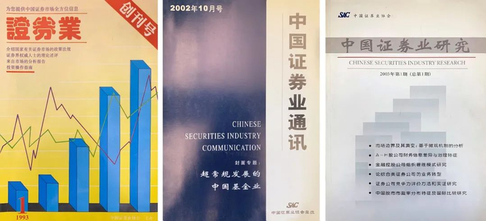 图1:《证券业》创刊号封面、《中国证券业通讯》《中国证券业研究》首期封面