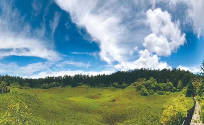 走着走着,逐渐地势起伏平缓,一大片空旷的高山草甸尽收眼底,这里大到足以举行万人盛会。
