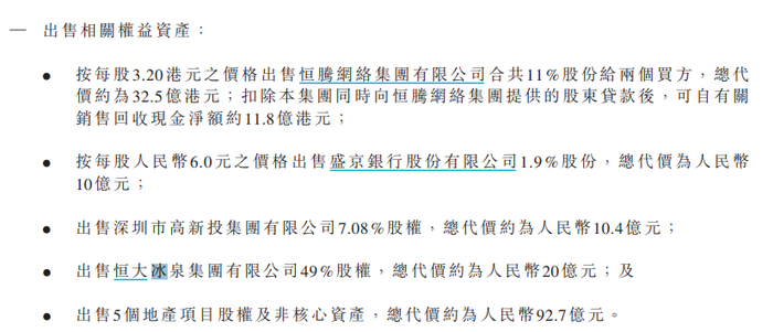 出售5个地产项目股权及非核心资产,总代价约92.7亿元。