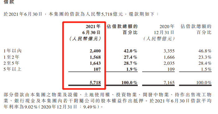 那么,恒大的负债到底有多少?半年报显示,于2021年6月末,恒大借款为5718亿元,其中一年内到期的负债为2400亿元:
