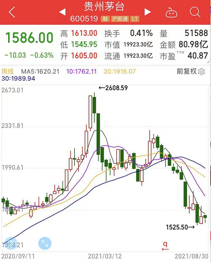 值得关注的是,在高卫东的任期内,贵州茅台在一度创下2608.59元的历史最高价。但在此后,茅台股价不断走低,截至昨日收盘,贵州茅台报1586元,自年内高点已跌去39.2%,股价缩水超1.28万亿。