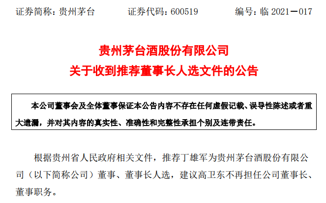 昨日晚间,贵州茅台在上交所公告称,根据贵州省人民政府相关文件,推荐丁雄军为贵州茅台酒股份有限公司董事、董事长人选,建议高卫东不再担任公司董事长、董事职务。