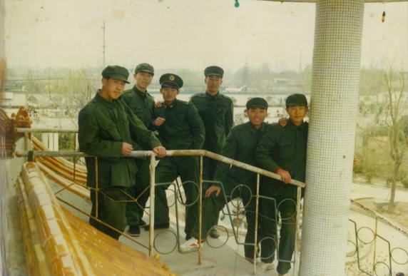 1990年,父亲(右三)在新兵连与战友的合影,摄于南京。