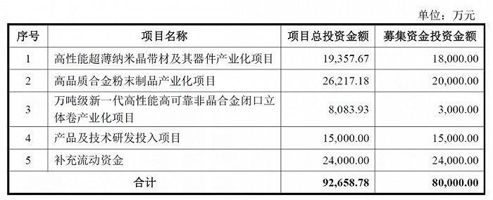 本次IPO,青岛云路拟募集资金8亿元,用于高性能超薄纳米晶带材及其器件产业化项目、高品质合金粉末制品产业化项目、万吨级新一代高性能高可靠非晶合金闭口立体卷产业化项目、产品及技术研发投入项目以及补充流动资金。
