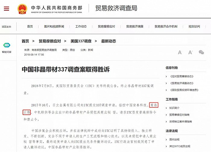 2017年,国际竞争对手向美国国际贸易委员会(ITC)提交了非晶带材商业秘密337调查,指控包括青岛云路在内的多家企业对美国出口或在美国销售的非晶带材产品侵犯其商业秘密。当时摆在青岛云路面前有两条路,一条是积极应对,但时间漫长、耗费巨资,另一条是不应诉,结果是失去美国甚至全球市场,不仅青岛云路的产品将被禁止进入美国市场,而且,普遍排除令若被签发,国内所有相关企业都将面临被禁止进入美国市场的风险,这将严重影响国内非晶产业发展。