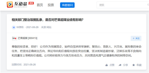 结合股价波动,投资者集中关注的还是政策调整带来的影响,比如“相关部门整治饭圈乱象,是否对芒果超媒业绩有影响?”