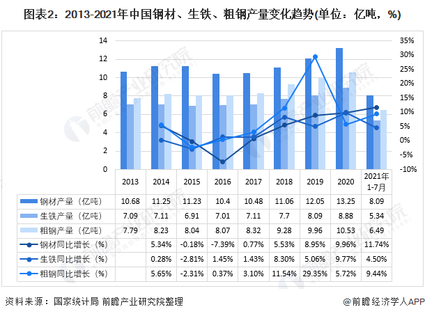 2021年1-7月,中国钢材、生铁、粗钢产量分别为8.09亿吨、5.34亿吨和6.49亿吨,较2020年同期均有明显增长。
