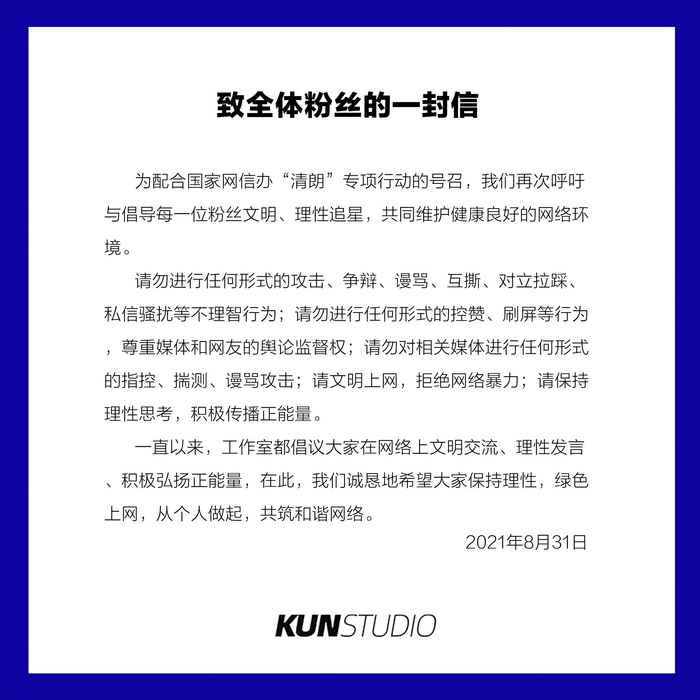 另外,@蔡徐坤工作室在《致全体粉丝的一封信》中写道:为配合国家网信办“清朗”行动的号召,再次呼吁与倡导每一位粉丝文明、理性追星,共同维护健康良好的网络环境。