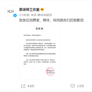 @蔡徐坤工作室在致歉信中表示,“针对近期关于专辑发行计划的讨论,工作室高度重视,第一时间认真自查,深刻认识到在专辑发售之初,未尽到提前以显著方式提醒告知全部歌曲上线时间的义务。”并向各位消费者诚恳致歉,感谢来自媒体和网友的监督。