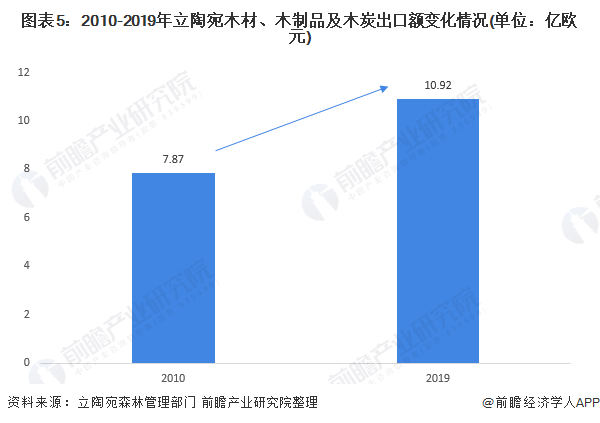 立陶宛木材加工、家具和造纸行业历史悠久,产品质地优良,大部分木材工业产品出口给周边国家,有一定行业竞争力,对外贸易持续增长并保持顺差。根据欧美统计,立陶宛木材、木制品及木炭出口额从2010的7.87亿欧元增长到2019年的12.41亿美元(10.92亿欧元)。