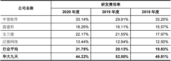 与同行上市可比企业相比,华大九天的研发费用率远超行业平均值。2018-2020年,中望软件研发费用率分别为33.25%、29.91%和33.14%。盈建科研发费用率分别为15.57%、16.11%和18.26%。宝兰德研发费用率分别为17.97%、21.55%和22.17%,泛微网络研发费用率分别为12.5%、12.94%和13.44%。行业平均研发费用率分别为19.83%、20.13%和21.75%,去年华大九天研发费用率高出行业平均值22.47个百分点。