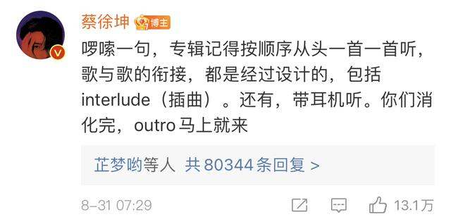 在被媒体指出新专辑卖出8000万元,但发售4个月后仍有6首歌未“交付”后,8月30日上午,蔡徐坤个人专辑《迷》的剩余歌曲连夜上线。但网友争议没有平息。