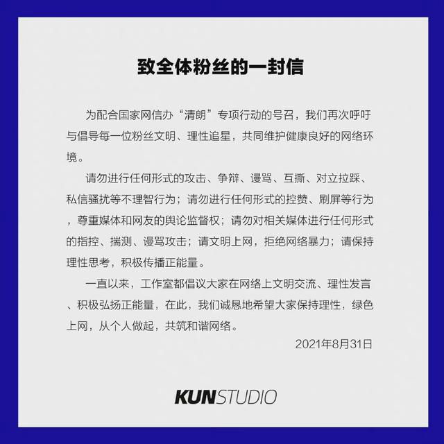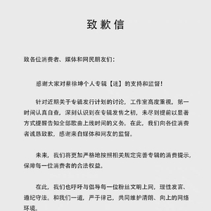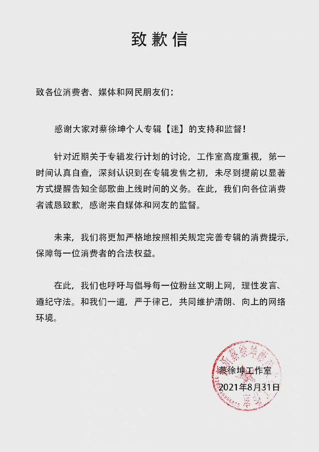8月31日下午,蔡徐坤工作室发出“致歉信”称,“工作室深刻认识到专辑发售之初,未尽到提前以显著方式提醒告知全部歌曲上线时间的义务,对此向消费者诚恳致歉,未来将更严格地按照相关规定完善专辑的消费提示,保障消费者合法权益”。与“致歉信”一起发出的还有一封“致全体粉丝的信”,呼吁粉丝文明、理性追星,“请勿进行任何形式的攻击、争辩、谩骂、互撕、对立拉踩、私信骚扰等不理智行为;请勿进行任何形式的控赞、刷屏等行为,尊重媒体和网友的舆论监督权;请勿对相关媒体进行任何形式的指控、揣测、谩骂攻击……”,“保持理性思考、积极传播正能量”。