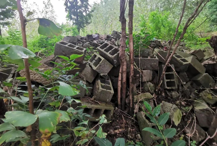 周庆春生前居住的河边小屋如今已是一片废墟,周庆春遇害后,被捆上图中的空心砖沉入沂河