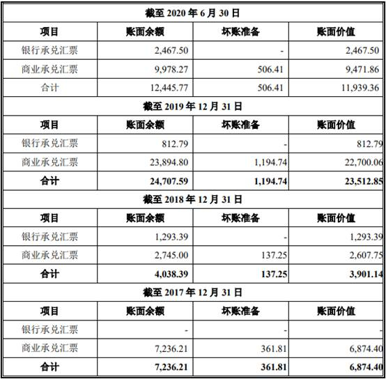 2017年至2020年1-6月,新疆派特罗尔应收票据账面余额分别为7236.21万元、4038.39万元、2.47亿元、1.24亿元,应收票据账面价值分别为6874.40万元、3901.14万元、2.35亿元、1.19亿元,占流动资产比例分别为11.57%、4.27%、15.30%、10.63%。