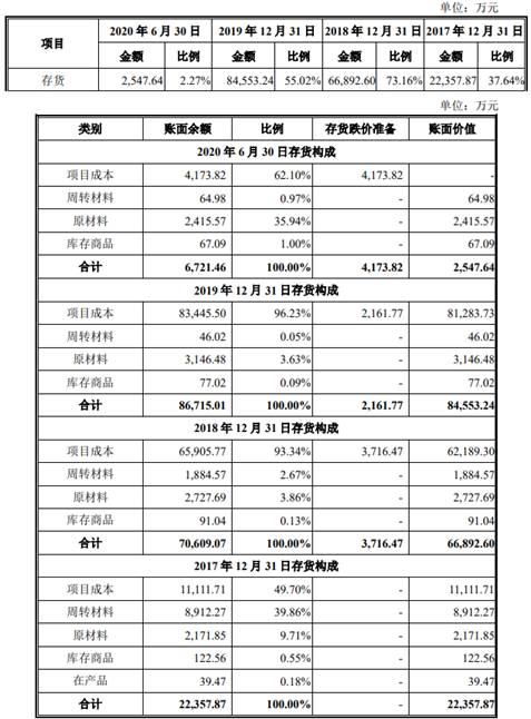2017年至2020年1-6月,新疆派特罗尔存货账面价值分别为2.24亿元、6.69亿元、8.46亿元、2547.64万元,占流动资产比例分别为37.64%、73.16%、55.02%、2.27%。