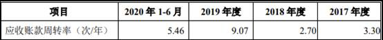 2017年至2020年1-6月,新疆派特罗尔应收账款周转率分别为3.30次、2.70次、9.07次、5.46次。