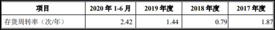 2017年至2020年1-6月,新疆派特罗尔存货周转率分别为1.87次、0.79次、1.44次、2.42次。