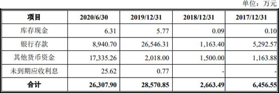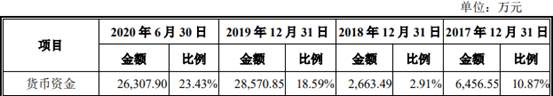 2017年至2020年1-6月,新疆派特罗尔货币资金分别为6456.55万元、2663.49万元、2.86亿元、2.63亿元,占流动资产比例分别为10.87%、2.91%、18.59%、23.43%。