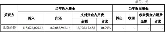 2017年,新疆派特罗尔向关联方北京派特拆入资金1.19亿元,归还资金1.89亿元,支付资金占用费272.62万元。