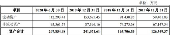 2017年至2020年1-6月,新疆派特罗尔资产合计分别为12.65亿元、16.57亿元、24.11亿元、20.79亿元,其中,流动资产分别为5.94亿元、9.14亿元、15.37亿元、11.23亿元,非流动资产分别为6.71亿元、7.43亿元、8.74亿元、9.56亿元。