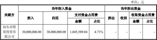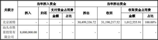 2019年,新疆派特罗尔向关联方汕头市胜景投资有限公司拆入资金3000.00万元,归还资金3800.00万元,支付资金占用费104.56万元。
