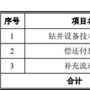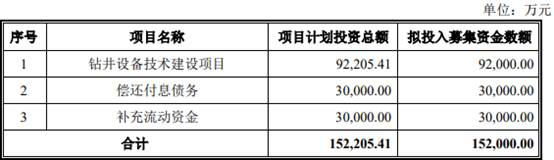 1.钻井设备技术建设项目,项目计划投资总额9.22亿元,拟投入募集资金数额9.20亿元;2.偿还付息债务,项目计划投资总额3.00亿元,拟投入募集资金数额3.00亿元;3.补充流动资金,项目计划投资总额3.00亿元,拟投入募集资金数额3.00亿元。