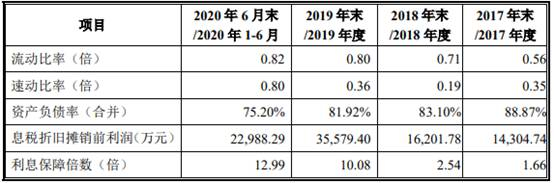 2017年至2020年1-6月,新疆派特罗尔合并资产负债率分别为88.87%、83.10%、81.92%、75.20%,流动比率分别为0.56倍、0.71倍、0.80倍、0.82倍,速动比率分别为0.35倍、0.19倍、0.36倍、0.80倍。