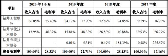2017年至2020年1-6月,新疆派特罗尔钻井工程服务收入占比分别为79.59%、72.69%、84.17%、86.05%,毛利率分别为16.23%、24.85%、17.90%、25.40%。