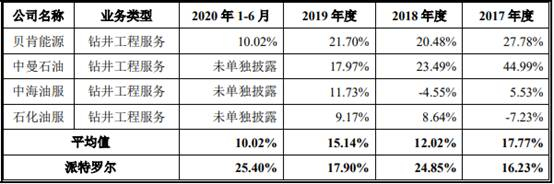 2017年至2020年1-6月,新疆派特罗尔钻井工程服务同行业公司毛利率均值分别为17.77%、12.02%、15.14%、10.02%。其中,贝肯能源同期毛利率分别为27.78%、20.48%、21.70%、10.02%,中曼石油2017年至2019年毛利率分别为44.99%、23.49%、17.97%,中海油服2017年至2019年毛利率分别为5.53%、-4.55%、11.73%,石化油服2017年至2019年毛利率分别为-7.23%、8.64%、9.17%。