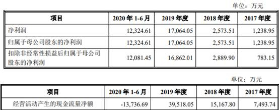 2017年至2020年1-6月,新疆派特罗尔归属于母公司股东的净利润分别为1238.95万元、2573.51万元、1.71亿元、1.23亿元,扣除非经常性损益后归属于母公司股东的净利润分别为783.15万元、2889.90万元、1.69亿元、1.21亿元,经营活动产生的现金流量净额分别为7493.74万元、1.52亿元、3.95亿元、-1.37亿元。