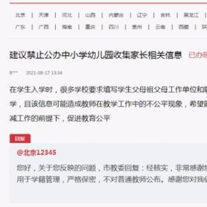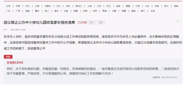 近日,有网友在人民网“领导留言板”反映,很多学校在学生入学时要求填写学生父母、祖父母工作单位和职务等信息,希望能对此行为予以禁止,只登记父母基本信息。该网友希望,“在做好双减工作的前提下,促进教育公平。”就该网友反映的问题,北京市教委回复表示,该信息严格保密,不对普通教师公布,正在研究取消父母职务信息的收集。