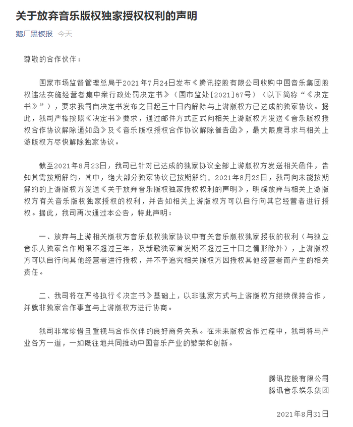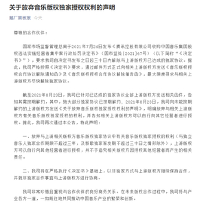 7月24日,国家市场监管总局依法对腾讯作出责令解除网络音乐独家版权等处罚,其中要求腾讯音乐30天内解除独家版权协议。腾讯在最新公告中称,其已向未能按期解约的上游版权方发送《关于放弃音乐版权独家授权权利的声明》。