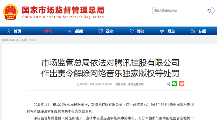 7月24日,国家市场监管总局通报,依法对腾讯控股有限公司作出责令解除网络音乐独家版权等处罚。