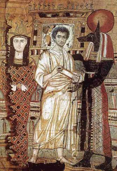 希腊罗马时期木乃伊裹尸布的画面,从另一个侧面反映了这些生活在埃及的希腊罗马人的复杂文化心态。以《亡灵书》的相关内容为主题的裹尸布是埃及墓葬传统的特色,在希腊罗马时期一直延续使用,通常是在木乃伊入棺后,覆盖在木乃伊的上方。彩色的木乃伊裹尸布在上埃及尤为普遍。这上面我们看到了埃及的死神阿努比斯,和另外两个形象的人,这两个应该都是死者的形象,一个是四分之三侧面的罗马人的形象,一个是正面的埃及人的形象,这就是双面社会的最好的象征。这是一个人的两种形象,他是罗马时期生活在埃及的希腊人,希腊的面孔,罗马的服饰,又接受了埃及的墓葬习俗。他订制木乃伊肖像画的时候,心里是有迟疑的:我究竟该以什么样的形象出现在另外一个世界的死神面前呢?是我本来的样子,还是按照埃及的规矩来呢?于是在不放心的情况下,他把两个形象都画上了。内心独白是这样的:到了那边,不管见到的是埃及的死神奥赛里斯,还是我们希腊罗马的神,都能认得出我来。