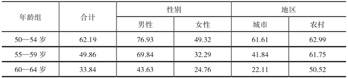 表1. 2017年我国低龄/准老年群体分年龄、性别和城乡的人口在业比例(%)