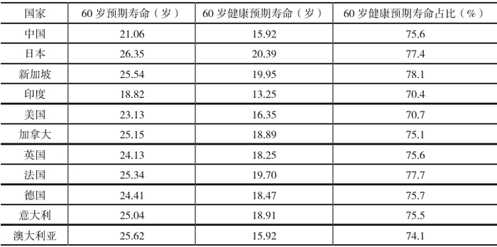 表2. 2019 年世界主要国家的60岁预期寿命/健康预期寿命