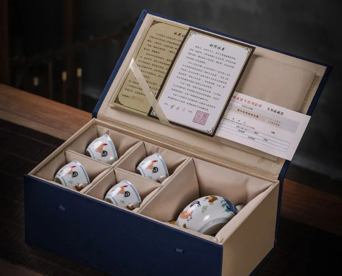 曹国飞老师以大明成化斗彩鸡缸杯为原型,同工、同料、同技,耗费1年时间,经历万次试验,成品率只有5:1,终于再现明成化斗彩鸡缸杯之神韵。该茶礼含有一张收藏证书和一张曹国飞老师的创作证书,为收藏保驾护航。