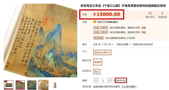 哪怕是几年前故宫限量发行的《千里江山图》复刻装饰画,售价也从千余元涨到15000元!古玩市场的价格更是翻了10倍以上!