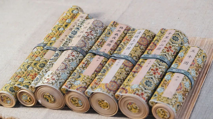 除了在画芯上讲究,七大传世名画还使用宋锦锦绫进行了手工装裱。