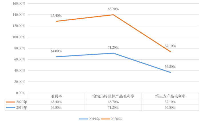 再来看看,利润率。还是以泡泡玛特为例,财报显示,泡泡玛特品牌产品的毛利率虽同比有所下降但2020年也高达68.7%,第三方产品毛利率同比不降反增至37.1%。而2020年整体的毛利率为63.4%,与2019年的64.8%相差甚少。
