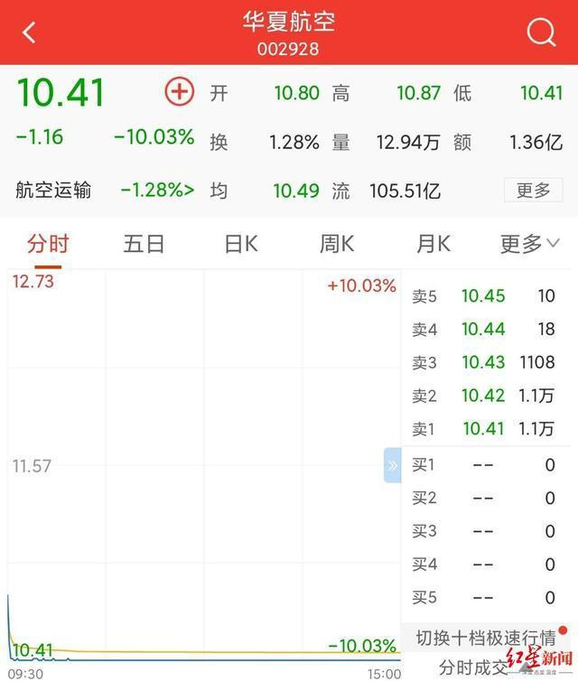 8月30日早间,华夏航空(002928.SZ)大幅低开后,3分钟内急速跌落至跌停板。红星资本局注意到,华夏航空股价在轻微波动后,至上午10:08被封死跌停。截至下午收盘,华夏航空仍躺在10.41元/股的跌停价上,总市值105.5亿元。