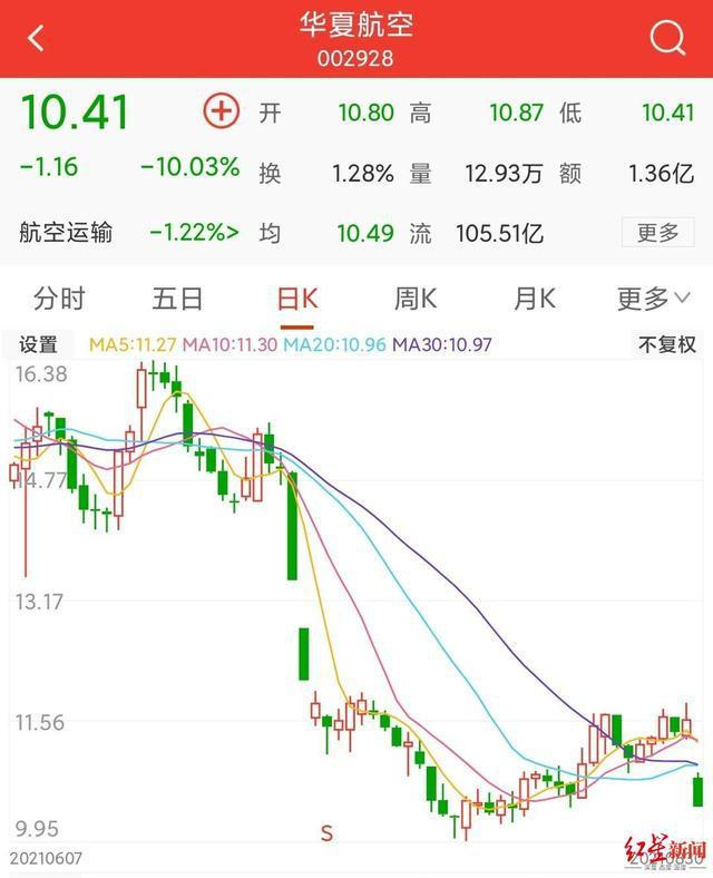 8月30日开盘后不久,华夏航空股票就告跌停。而从今年6月24日盘中16.38元/股的近期高点迄今,华夏航空最近两个多月的累计跌幅达36.45%。